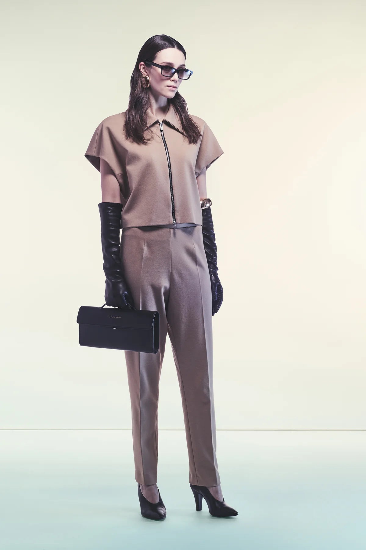 Chaqueta milanesa de punto de corte cuadrado con cuello de camisa, mangas cortas tipo kimono y cierre frontal con cremallera de doble cursor.