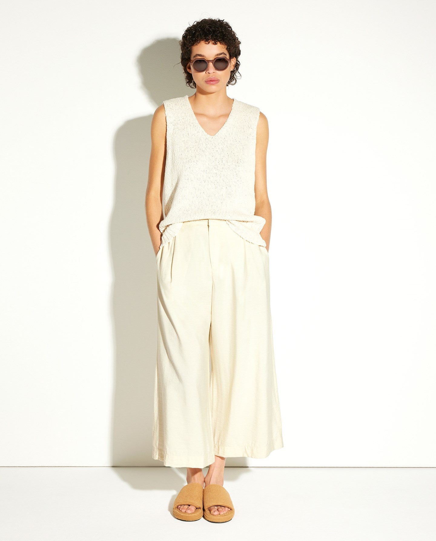 Elvine presenta el pantalón Ritva, inspirado en una falda y fabricado con una mezcla de viscosa semi-brillante. Una pierna ancha ligeramente acortada, combinada con detalles plisados, le proporciona a la usuaria la libertad y frescura de una falda con la seguridad de un pantalón. Está equipado con un solo pliegue profundo en la parte delantera, bolsillos y una cintura elástica en la parte trasera. Para salidas veraniegas .