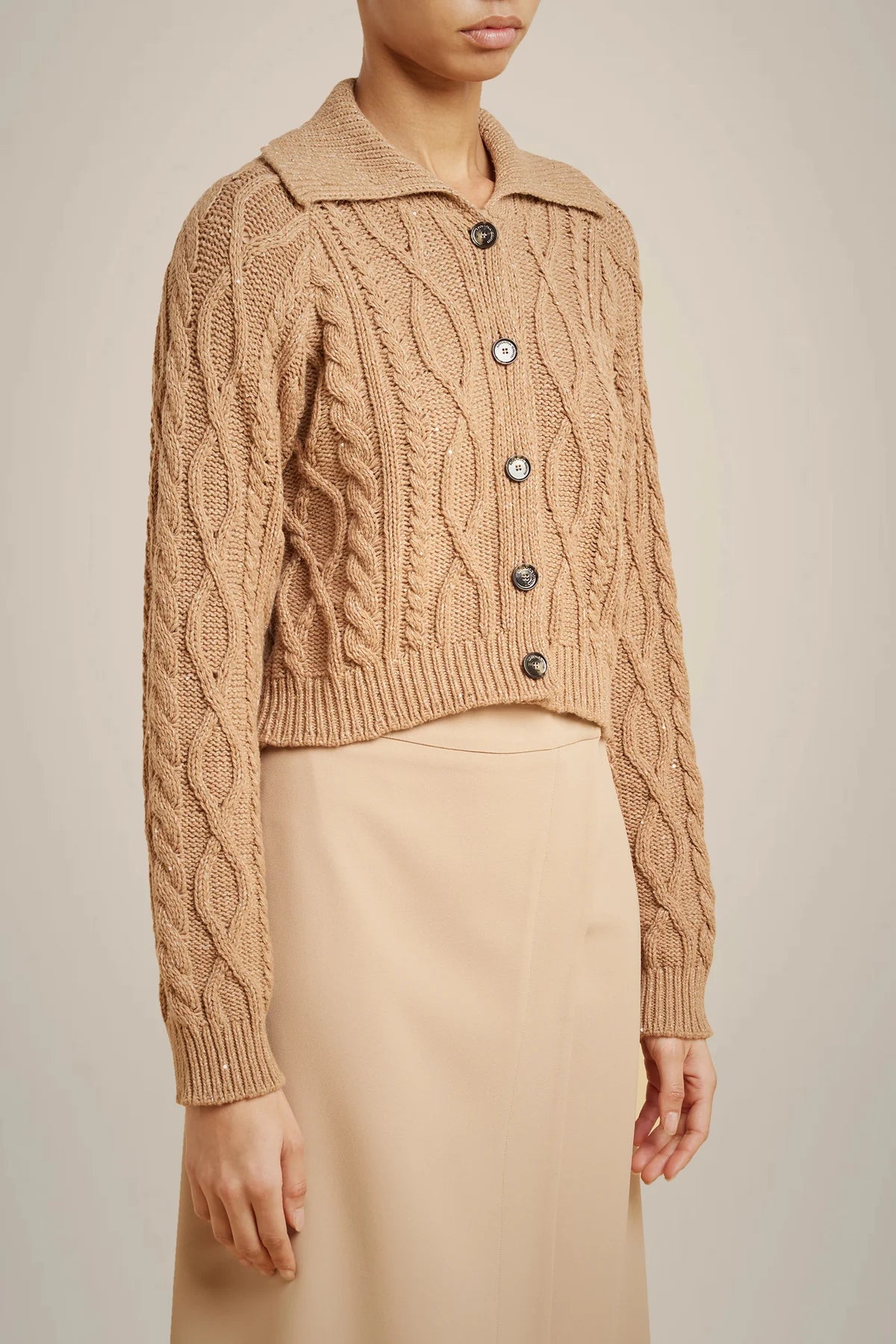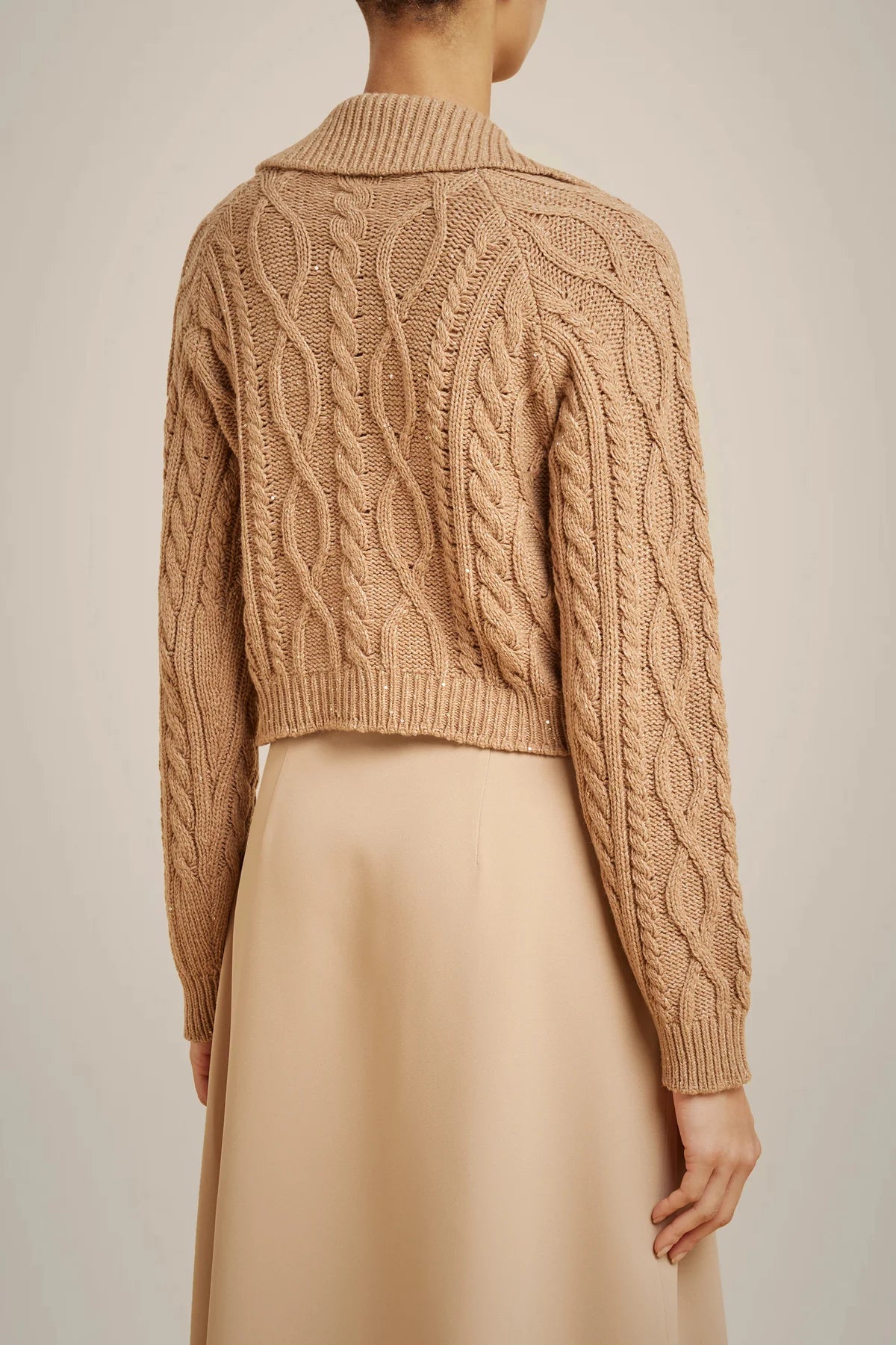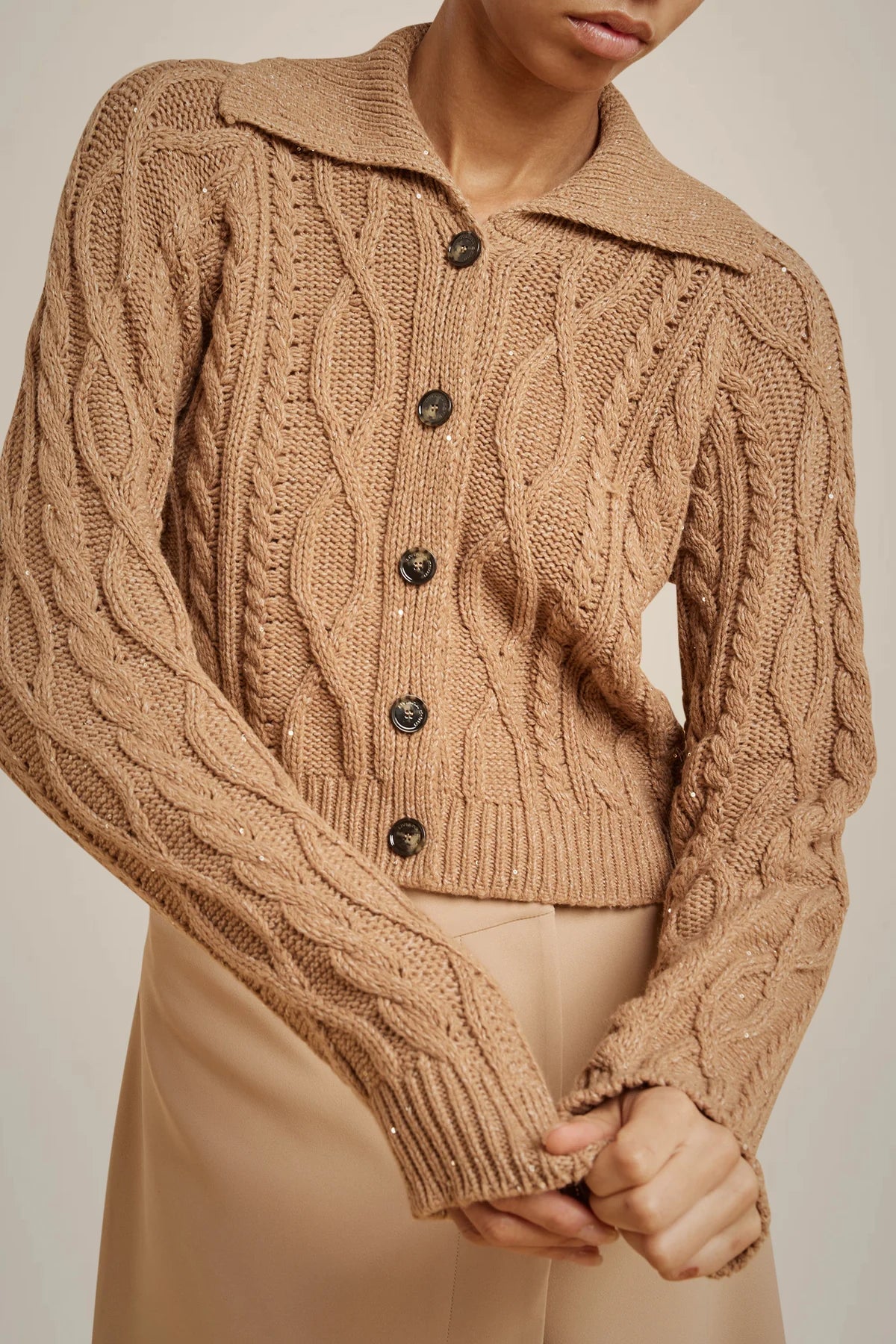 Este cómodo cardigan corto está hecho de cashmere reciclado y decorado con micro lentejuelas. Sus mangas raglán largas y su patrón de tejido de cable y diamantes lo hacen una prenda única. Con cuello acanalado, botones frontales y bordes también acanalados, es una opción elegante y sostenible para cualquier ocasión.